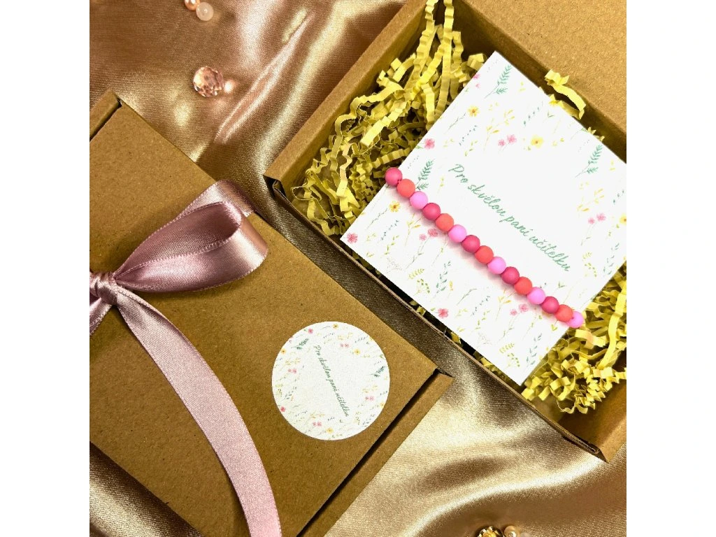 Dárkové balení s náramkem. Obsahuje krabičku s dřevitou vlnou, náramek a kartičku s nápisem "Pro skvělou paní učitelku". Krabička je zdobena stuhou.