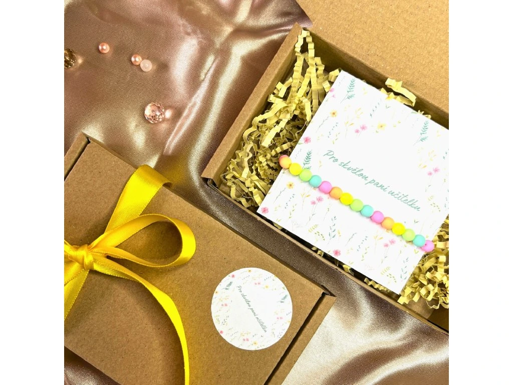 Dárkové balení s náramkem. Obsahuje krabičku s dřevitou vlnou, náramek a kartičku s nápisem "Pro skvělou paní učitelku". Krabička je zdobena stuhou.
