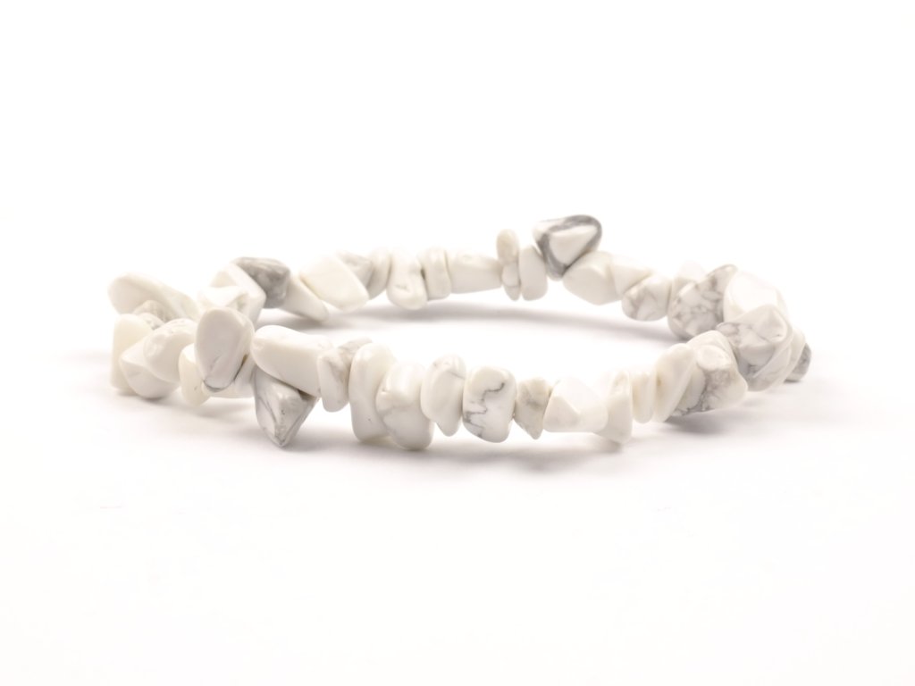 Náramek je vyroben z obroušených zlomků bílého howlitu.